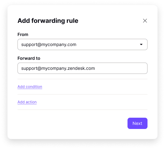 Um eine Weiterleitungsregel zu erstellen, gib einfach die E-Mail-Adressen ein, von denen und an die du weiterleiten möchtest.