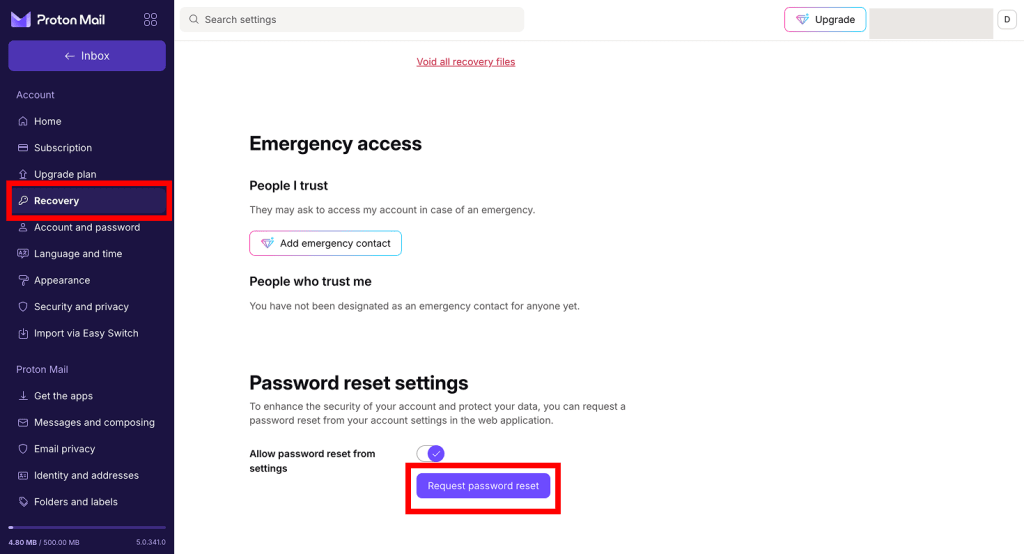 1. Sign in to your Proton Account. Open your account settings (Settings ⚙️ → All settings), then select Recovery from the sidebar.